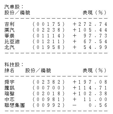 藍籌表現方面,今年升幅最大為吉利(00175),全年累升271.74%,藍籌新貴碧桂園(02007)及舜宇(02382)則分別累升268.17%及197.08%。跑輸的有聯想集團(00992)及中石油(00857),分別跌0.56%及3.63%。