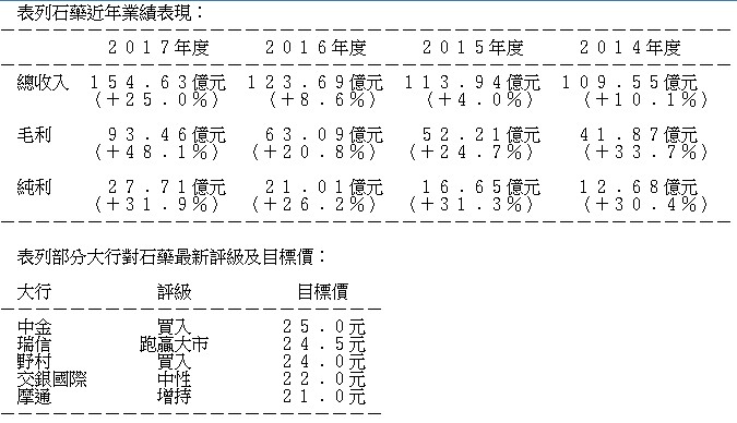 野村此前發表研究報告指,對石藥前景更樂觀,加上估值便宜,預料2018至2021財年會錄得強勁純利增長,將石藥維持為行業首選,評級「買入」,目標價為24元。