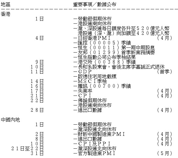 不過,溫氏預計港股在5月上半月的壓力會待續,再加上此次跌市,未見有太多投資者撈底,反映市場氣氛仍較審慎。料大市走勢要到在5月底至6月初才有機會好轉,相信有關中美貿易戰、美國國債孳息率高企等消息將會被消化,加上若企業業績造好,投資者將更積極入市,有利投資氣氛。