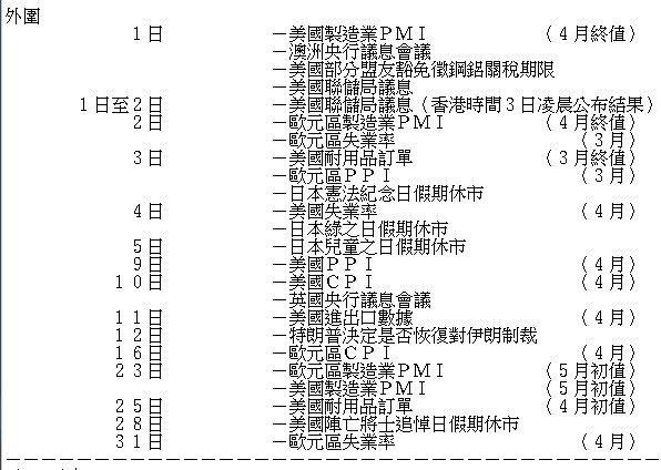 美國貿易代表處在4月初公布總值約500億美元的中國商品加徵25%懲罰性關稅清單,中國政府旋即公布對500億美元原產美國商品加徵關稅,中美貿易戰升溫,令港股於月初一度跌穿三萬點大關,曾見29518點創出本月最低位。美國總統特朗普其後指示美國貿易官員,考慮對另外1000億美元中國商品加徵關稅,亦為市場憂慮火上添油。