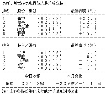 表列5月恒指表現最佳及最差成分股: