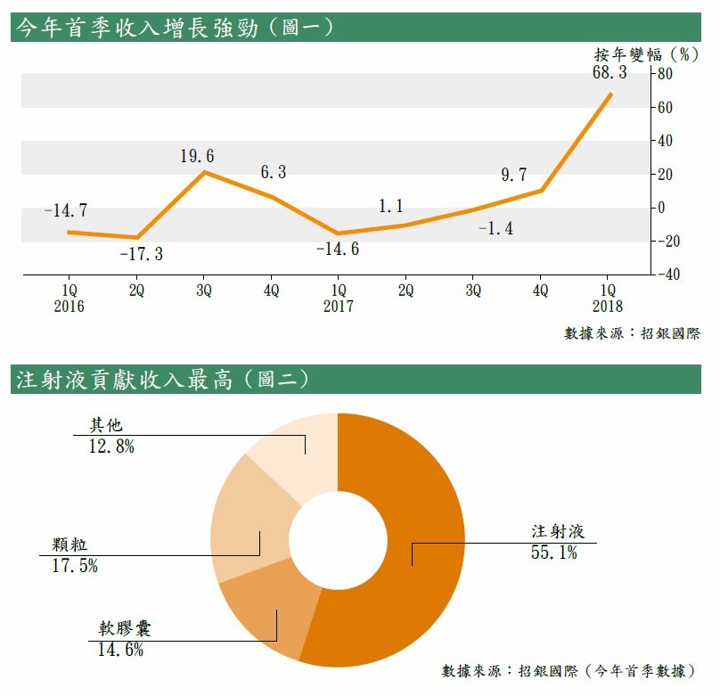 今年首季清開靈注射液產品受惠於流感盛行,銷售額按年增近110%。不過大華繼顯認為,舒血寧注射液及參麥注射液的銷售增長同樣具備潛力,皆因集團於去年第四季開始改革銷售渠道,由公司自行營運銷售團隊,該行預計重組於今年第三季完成後,舒血寧注射液及參麥注射液將成為集團的增長動力。