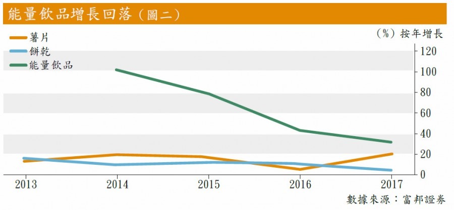 集團多年前推出的產品包括糕點、涼茶先後進入瓶頸期,增長只能說不過不失。而近五年一直為集團主打的明星產品「樂虎」能量飲品,銷售增長亦見急速回落(見圖二),集團要保持增長就需要不斷推陳出新。
