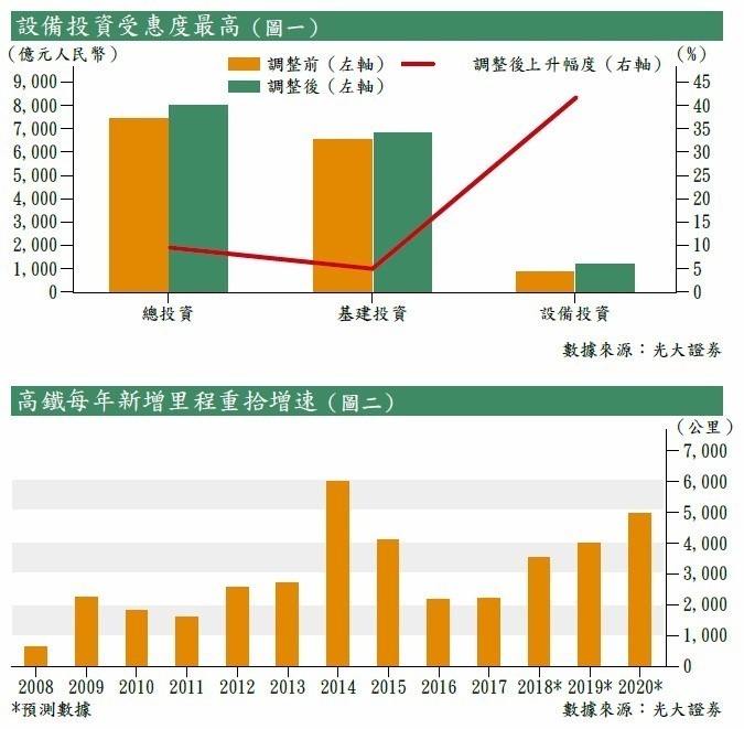 今年1月,中國鐵路總公司在年度工作會議中,將全國鐵路總資產投資降至7,320億元,設備投資額只有800億元,兩者均低過市場預期,因此整個板塊上半年表現相當不濟。不過,貿易戰的來臨令中國經濟出現變數,而加快基建的構思亦隨即聞風趕至。上月中鐵總公布《2018至2020年貨運增量行動方案》,方案提出到2020年,全國鐵路貨運量達47.9億噸,較2017年大幅增長三成。建設超預期速度的增長,市場推算基建投資總額有望重上8,000億元,設備投資增幅更達四成(見圖一),即時令相關板塊起死回生。