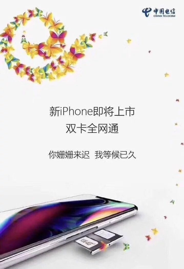 早於個多月前市場已有消息指,Apple今年推出的三款新iPhone之中,部分將支援雙卡雙待功能,隨即引起各界廣泛關注。每逢新iPhone發布日臨近,電訊商的消息和各路諜照更滿天飛。最近,網上就流出了一張中國電信的新iPhone宣傳圖,明確寫明新一代的iPhone「雙卡全網通」。