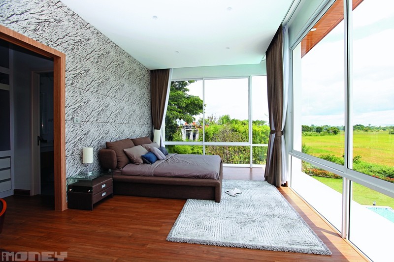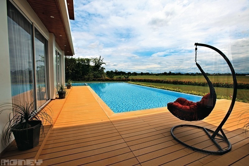該60萬平方呎地皮,相等於三分一個維園的面積,或140個標準籃球場,三邊有小河圍著,地勢有如一個小城堡,前面是一望無際的翠綠米田,是Coffee約4年前與泰籍老婆一家四口移居清邁後,買入的私人別墅屋苑土地,目前仍在動工。走過小橋,眼前是一座超豪的示範屋,樓高兩層共3,000多平方呎,四個套房,並設偌大的私人泳池,比不少香港屋苑的會所泳池還要大。