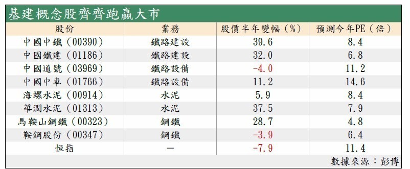 中美貿易戰初期,本欄曾指出內地為保經濟增長,料會加大基建投放力度,遂推介當時估值低殘的中鐵建(01186)。隨著貿易戰遲遲未有平息跡象,甚至愈演愈烈,基建股也愈來愈受市場追捧,中鐵建、中鐵(00390)紛紛逆市破頂,創52周新高,水泥和鋼鐵股縱未破頂,但亦大幅跑贏大市(見表),暫時相對落後的中國通號作為鐵路設備股,或可以叼一叼基建股的光。
