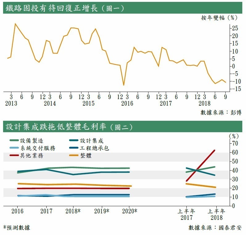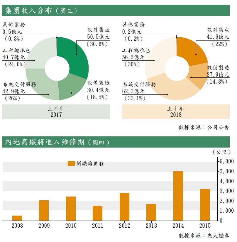 而觀察業務分布收入, 設計集成和設備製造均出現按年下降(見圖三),國泰君安指出,原因正是由於新簽定單項目實施的進度放緩所致。不過,該行預計新增鐵路里程將持續增加,尤其是高鐵里程,將會帶動集團軌道交通控制系統的需求。