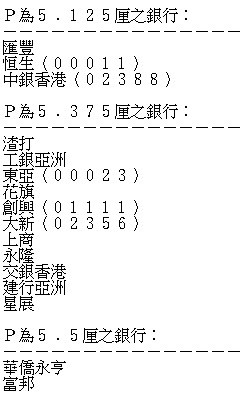 在9月底港銀宣布加息前夕,一個月拆息有3日處於2厘以上水平,當時銀行體系總結餘逾700億元。加息由龍頭大行匯豐啟動,將P(最優惠利率)及港元儲蓄利率齊齊上調0.125厘(即八分一厘)。其後恒生(00011)、中銀香港(02388)、渣打等跟隨,大部分銀行的加息幅度普遍為0.125厘,華僑永亨及富邦加幅最多,達0.25厘。市場上出現3個P,分別是5.125、5.375及5.5厘。