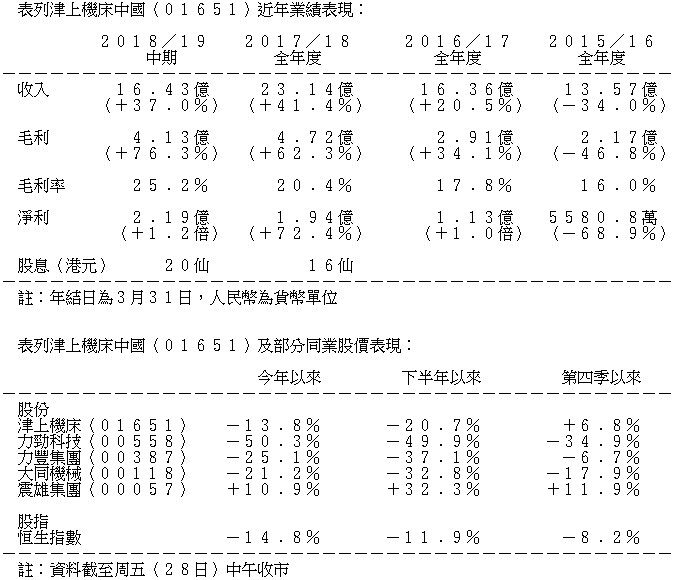 津上機床中國在11月中公布截至2018年9月底的中期業績,銷售收入上升37%,毛利上升76%,純利更上升117%至人民幣2.2億元,每股中期股息0.2港元。毛利上升乃受惠於生產量增加帶來規模效應和經營效率改善,毛利率較去年同期上升5.6個百分點,達到25.2%。純利大升則受惠於期間並無首次公開招股開支,融資成本大幅減少,而且其他收入及收益大增,主要來自匯兌收益和銀行利息收入。該公司的產品廣泛用於汽車、資訊科技及電子產品、自動化用零部件、醫療器械及工程機械,汽車業佔比最高,約33%,目前沒有明顯變化,但用於通訊業的產品銷售百分比則減少了約4.3個百分點至14.4%。該公司的銷售以中國為主,佔約68%,海外銷售則通過母公司日本津上進行,產品主要銷售往(不論會否加以訂製)日本、歐洲、美洲及東南亞等地區。業務一如預期般有所發展,擴建廠房將於2019年年初啟用;於截至9月底的回顧期內在中國增設了5個銷售網點,目前在中國共設立9間分公司,18個辦事處,分銷商數目則由209個增加至241個。