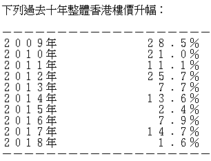 過去十年香港樓價「拾級而上」,根據差估署樓價指數顯示,2008年12月至2018年12月樓價指數由104﹒8點大漲2﹒42倍至358﹒4點。十年間樓價升幅最高的一年為2009年,2009年全年樓價升幅達28﹒5%,其次是2012年25﹒7%的升幅及2017年的14﹒7%。