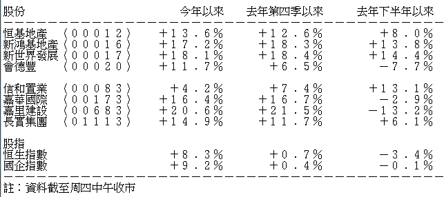 本地地產股方面,由於年初升勢已相當凌厲,他預計,未必再有重大突破,建議投資者在農曆新年假期前作局部調整,轉持較大規模且推盤量較多的地產股,作中線投資。他首選新地(00016),建議在十天線127元左右入貨,其次為新世界(00017),可以在二十天線即11.5元水平買入。