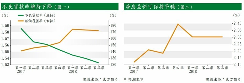 其中,按一級資本計的全球最大商業銀行工行,可以優先考慮。無疑,受宏觀經濟環境影響,工行2018年首三季的公司不良生成率有所反彈,約為0.89%,高於2017年的約0.64%。不過,其整體不良貸款率仍然下降,由2017年首季的1.59%降至2018年第三季的1.53%(見圖一)。東方證券認為,降準以及增持免稅地方政府債券推高投資收益率的積極影響,或可抵銷貸款收益率下降,尤其是小微企業帶來的不利影響。除非央行出乎預期減息,否則工行的淨息差料可保持在2.3厘左右(見圖二)。