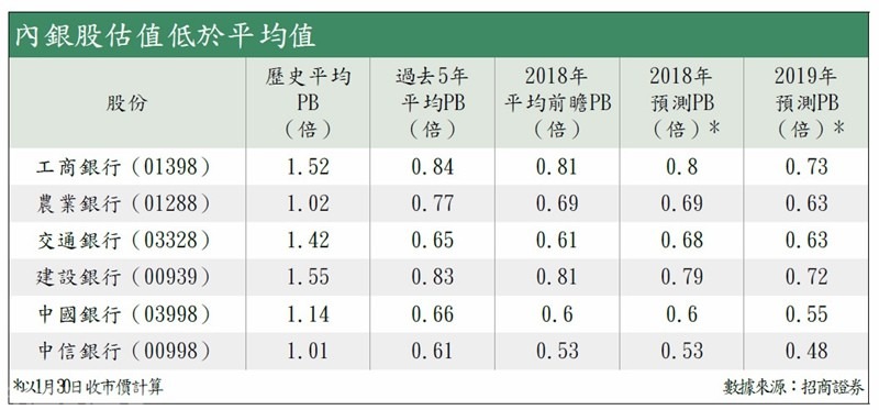 事實上,從估值角度看,目前的內銀股處於頗為吸引的水平。根據招商證券截至上月底的數據,工行、農行(01288)等六大內銀過去5年的平均PB,介乎0.61倍至0.84倍(見表),而今年的預測PB,普遍有逾一成差距。即是說,若內銀股估值回到平均水平,其股價可望有一成以上的升幅。