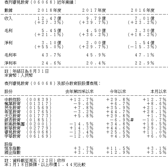 截至2018年8月底止,睿見教育年度收入增長27.3%至12億元人民幣,學費及住宿費收入約佔68%;毛利率由上年同期的45.9%略為下跌至43.7%,因收購及投資引致折舊增加所致。年度除稅前溢利則增加27.9%至約3.5億元人民幣。政府補助和利息收入大增而稅項大減,年度利潤於是增加53.4%至約3.1億元人民幣。政府補助主要來自因組織學校活動、教育服務發展及學校學術表現出色,而獲取的政府無條件補貼。利息收入則來自銀行利息收入和可供出售投資利息。