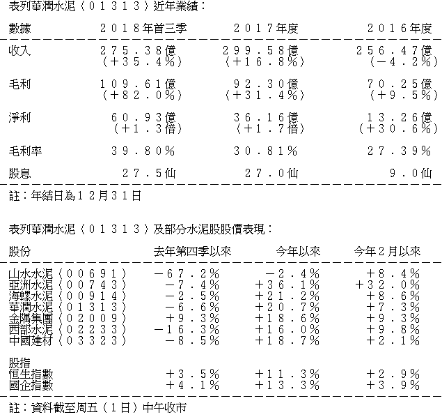 華潤水泥是2018年表現最佳的水泥股,全年股價升幅近五成。該公司自2018年年初至今共公布五次盈利喜訊,股價自然受惠上升。該公司每次公布盈喜的原因都是產品售價上升使毛利率提升。該公司的水泥產品於2018年首11個月的平均售價為375.2元,較上年年同期的291.2元上升28.8%,較2016年同期的243.8元則上升53.9%。華潤水泥增加股息也有助股價上升。該公司2017年的末期股息上升超過一倍至0.155元,2018年的中期股息也上升超過一倍至0.275元。目前華潤水泥的股息率在水泥股中屬較高者,目前預期息率達6.5%,往績息率報5%。