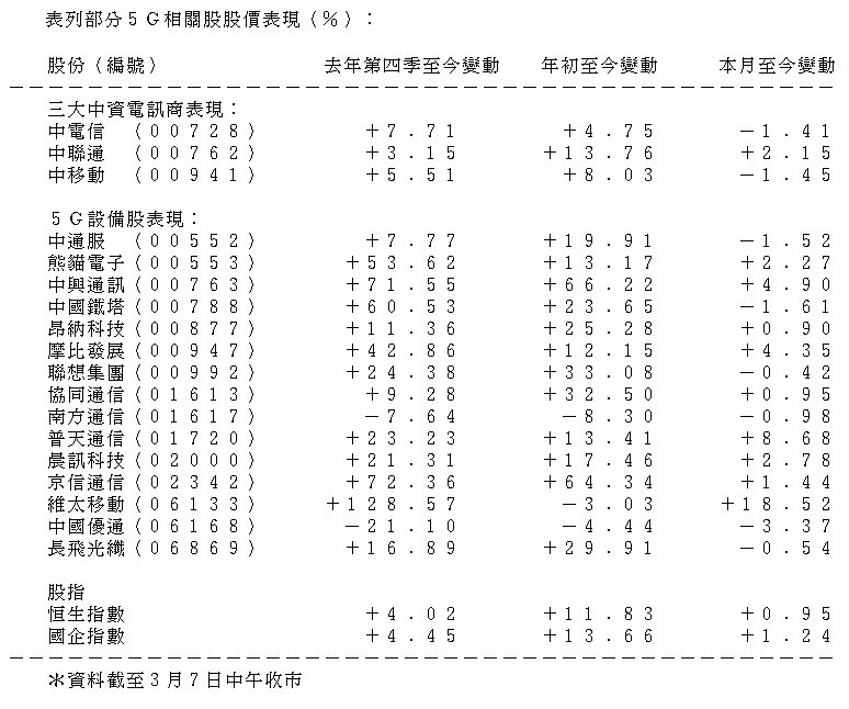 內地工信部於上月表示,中國商用5G於首五年直接帶動經濟總產出將超過10萬億元,經濟增加值將超過3萬億元,創造就業機會超過300萬個。未來三年光是網絡累計投資將逾300億元,拉動行業相關消費2000億元,可見發展程度相見龐大。