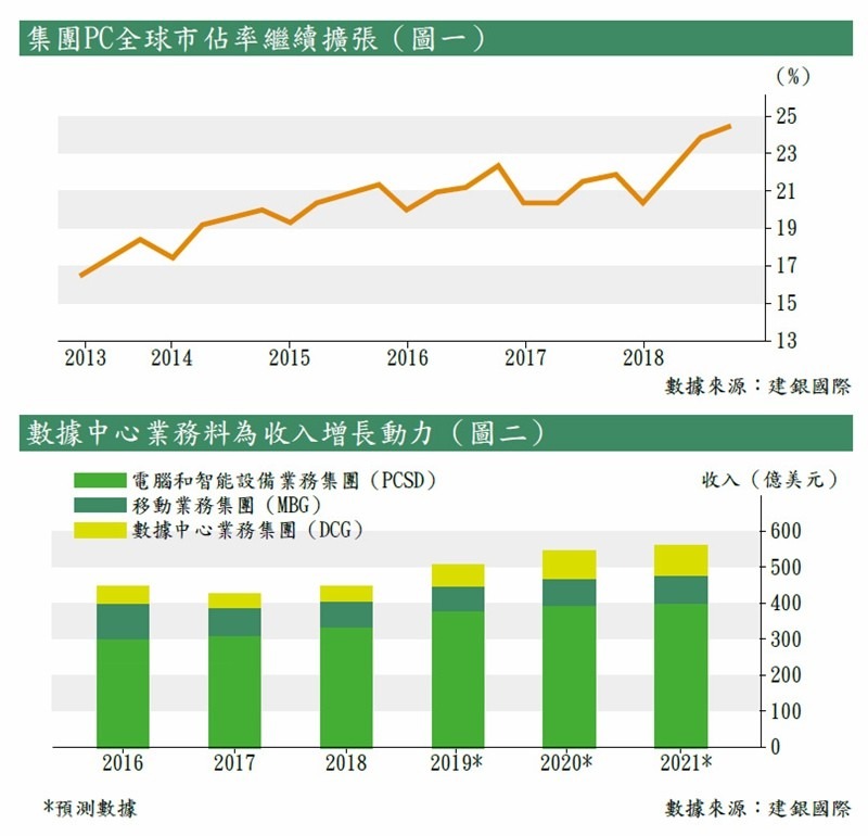 建銀國際認為,雖然環球PC市道增長緩慢,但聯想PC一哥地位不變,市佔率更可進一步擴張(見圖一),因此盈利仍有向上空間。