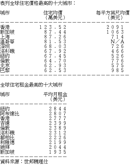 報告研究了全球35個城市的樓市,亞洲樓價高企,香港樓價維持全球最貴。報告指出,本港平均房價高達逾123萬美元(約963萬港元);豪宅市場亦是全球最貴,平均價為690萬美元(約5382萬港元),第二至五位分別為新加坡、上海、溫哥華及深圳。