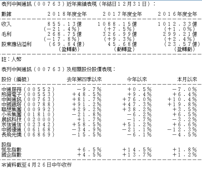 中興2018年的毛利難免下跌17.8%至約269億元人民幣,整體毛利率卻上升1.4個百分點至31.4%,因為毛利率較低的消費者業務的比重減少。中興年度股東應佔淨虧損為69.8億元人民幣,轉虧為盈,主要由於須向美國政府繳付10億美元罰款。