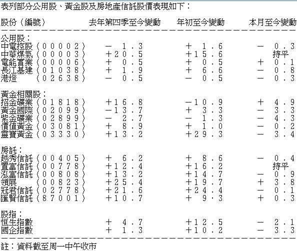 表列部分公用股、黃金股及房地產信託股價表現如下: