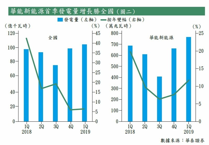 對比同業,華能新能源去年業績表現雖然稍遜,但換來低基數優勢。首季發電量按年升11%,增幅雖不算大,但全國平均僅增約6%(見圖二),已明顯勝一籌。