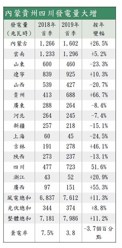 另一個華能新能源的優勢,是其棄風率處低水平。去年全年下降2.3個百分點至6%,低於全國平均值的7%後。連同光伏發電,集團今年首季的整體棄電率,由去年同期的7.5%大削至3.8%。正因如此,集團的發電量得以提升,尤其是內蒙古、貴州和四川表現較為突出,首季發電量按年分別提高26.5%、66.7%及51.6%(見表)。