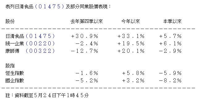 該公司於今年1月底宣布投資3000萬元在香港生產廠房設立的全新穀物麥片生產線已投產。此項投資使其能在香港生產穀物麥片產品,然後在香港及中國內地銷售,毋須在日本採購穀物麥片產品。該公司將根據未來銷售進度而決定是否再投資穀物麥片生產線。該公司的穀物麥片生產線能以較低成本生產穀物麥片,應付兩地市場的需求,同時可確保該公司能為健康意識日益提高的顧客提供合適產品,有利收入上升及提升競爭力。該公司亦於3月中宣布投資2000萬元在香港生產廠房提升棒丁麵生產線。棒丁麵生產線生產效率及效能的提升將有助該公司發展香港業務,產品且可能出口至中國及台灣。棒丁麵生產線將於年內完成。棒丁麵為非油炸麵,正好配合健康飲食的潮流。