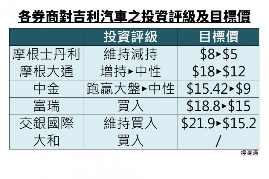 另外,摩根大通及中金亦分別將吉利的投資評級下調至「中性」。摩通將吉利目標價由18元下調33.3%至12元;中金則削其目標價41%至9元。