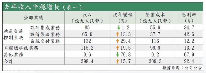 各主要業務,包括設計集成、設備製造、系統交付、工程總承包,只得前者的通信及訊號工程因屬於「站後工程」,集團承攬的項目大部分在去年下半年才大規模施工,令按年收入錄得輕微下跌。至於其餘三者,都錄得平穩增長,收入按年升逾一成至三成不等(見表一)。