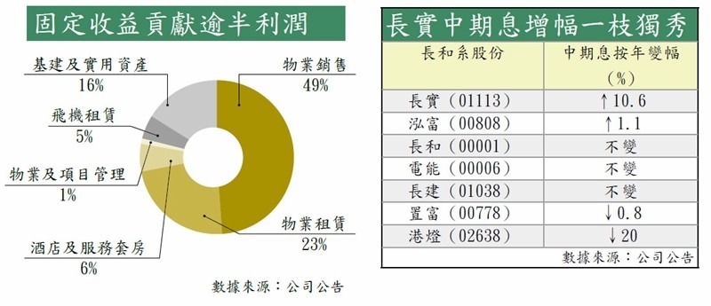 業務較長和更傾向本港的長實,上半年仍有七成利潤(見圖)由地產貢獻。旗下樓盤包括海之戀及愛炫美入帳的確認銷售利潤高達41億元,帶動集團的上半年的項目發展利潤按年大增2.3倍。摩通指出,多達400億元的賣樓收益有望於下半年確認,加上愛炫美成功以高價售出,集團下半年的發展利潤有望續見好表現。去年集團沽出中環中心的同時,亦買入位於英國倫敦的5 Broadgate辦公樓,物業租賃利潤得以持平。位於荃灣西站的海之戀商場預期短期內開業,當中9成樓面獲承租,如無意外將推動集團下半年收租利潤。