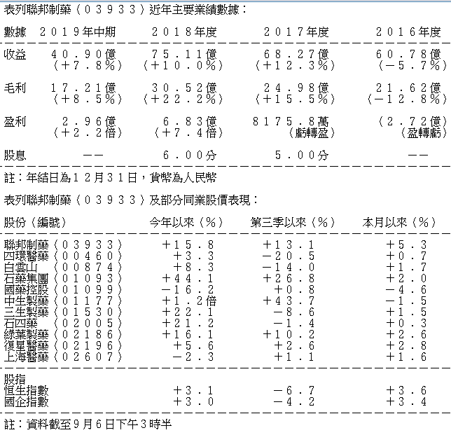 聯邦製藥是集研發、生產、經營於一體的綜合性製藥集團,主要從事銷售中間體、原料藥(抗生素產品)及製劑產品業務。該公司2019年上半年的收入增長7.8%至約41億元(人民幣.下同)。原料藥和制劑產品的銷售增長,抵銷了中間體銷售下跌的影響。未計利息、稅項、折舊及攤銷前溢利上升24.5%至7.8億元,估計主要來自原料藥和制劑產品的盈利貢獻。該公司的制劑產品包括胰島素系列產品(重組人胰島素注射液,商品名「聯邦優思靈」)和甘精胰島素注射液(商品名「聯邦優樂靈」)、注射用哌拉西林鈉他唑巴坦鈉(商品名「聯邦他唑仙」)、阿莫西林膠囊(商品名「聯邦阿莫仙」)和治療阿爾茨海默型癡呆的鹽酸美金剛(商品名「邦得清」)等,銷售收入增長由12%至76%不等。該公司因應市場變化調整了中間體及原料藥業務的銷售策略。中間體6-APA的市場價格下跌,該公司於是提高了半合成青黴素原料藥的銷售。該公司的中間體及原料藥在中國出口市場繼續佔有領先的行業地位。