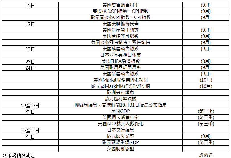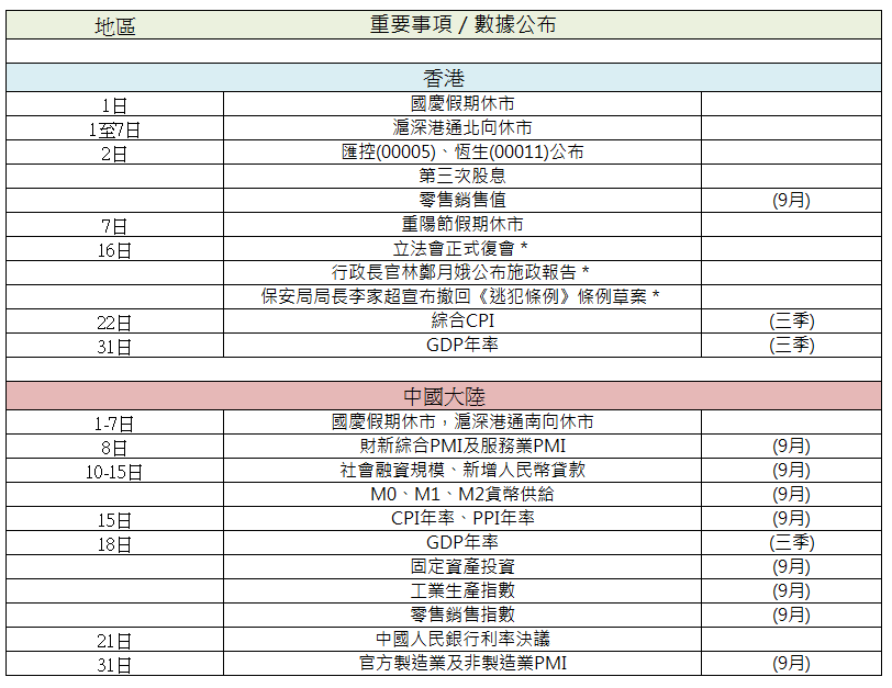 港股月中由升轉跌,雖然聯儲局一如預期再度減息四分一厘,但沙特油產設施受襲油價急升,穆迪下調本港評級展望,市場憂慮香港經濟出現負增長,拖累恒指失守二萬七關,雖然險守廿天線,但全周瀉917點,結束兩周連升。本月最後一周,中方代表突然取消訪問美國,令外界猜測中美關係惡化,加上美國民主黨對是否彈劾總統特朗普進行調查,環球股市氣氛受挫,恆指失守二萬六,全周跌480點。不過,港股經歷十連陰之後反彈,於本月最後一日、國慶前夕反彈137點,收復二萬六關口。