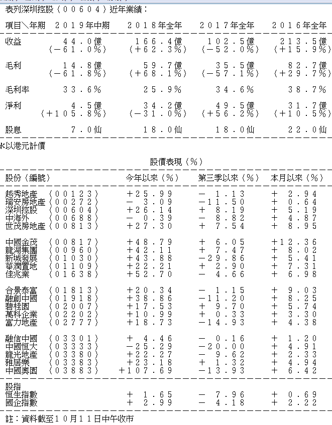 美中貿易談判變幻莫測,本港政局又同時陷入混沌狀態,導致大市持續反覆不穩,策略上,宜投資防守性較高的股份。作為紅籌收租內房股,深圳控股(00604)在大灣區坐擁優質土地儲備之餘,亦有深圳市政府持有的母公司支持。在業務上,今年下半年將會有七成項目收入入帳,加上中期純利已增逾倍,全年業績有望更上一層樓,中長線目標可看3.6元。