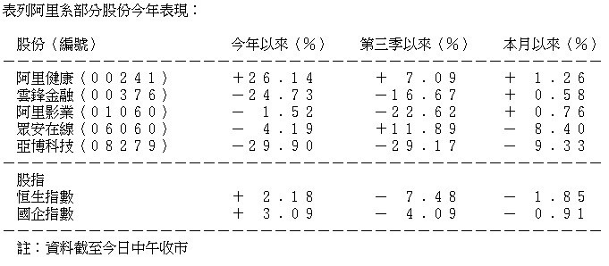 巨型新股阿里上市前夕,影子股概念是否可炒作? 李偉傑表示,阿里旗下阿里健康(00241)及阿里影業(01060)在早前「雙十一」已經炒作過,料再有炒作機會不大。