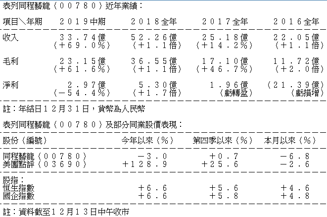 今年以來,同程藝龍業績表現表面上理想,但業務受到同業競爭影響,盈利能力下跌,卻是不爭的事實。該公司2018年的毛利率為69.5%,今年方面,除了第一季的毛利率高達72.1%外,第二季和第三季分別只有64.7%及66.9%,表現一直較去年全年度數字遜色。該公司正盡力爭取收入以彌補盈利能力下跌的影響。