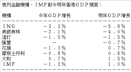 展望2020年,中美貿易戰雖然稍有緩和跡象,但環球經濟放緩亦已成定局,再加上本地社會事件續發酵,因此多間金融機構看淡香港經濟前景,下調香港今、明兩年的GDP預測,大部分機構預計香港明年經濟會收縮,市場預測香港今年GDP將介乎增長0.7%至收縮2.2%,至於明年GDP預測則介乎增長1.5%至收縮5.8%。當中看得最淡的ING銀行表示,香港面對的問題不只限於技術性衰退,而是受到內外多項因素夾擊,假設香港的社會動盪持續一整年,預計明年的GDP將收縮5.8%。