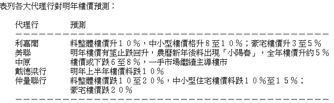 值得注意是,由於中美達成第一階段貿易協議,市場對明年樓市看法未算一面倒悲觀。戴德梁行指出,中美成功達成首階段協議,對樓價有支持作用,因此對明年樓市看法轉趨樂觀,故將明年上半年樓價跌幅預測由10至15%,修訂至跌10%。至於在地產代理行中,以利嘉閣看法最「牛」,預期農曆新年後樓市可逐步復甦,明年整體樓價有望出現「噴射式」,全年料升10%,其中,中小型住宅樓價明年料升8%至10%;而豪宅樓價則升3%至5%。