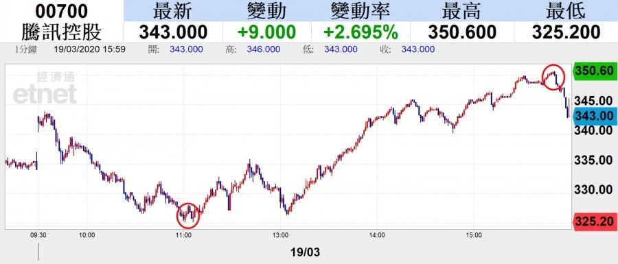 美股近日連番暴瀉,雖然聯儲局及華府積極放水,但仍引起投資者情緒不安,今早亞洲股市動盪,港股低開70點後跌幅逐步擴大,盤中一度試過低見21139點大跌1151點,為2016年年中以來的低位。午後騰訊(00700)因業績關係逆市抽升逾3%,中移動(00941)年度純利表現勝市場預期,股份一度由跌轉升。兩大重磅股表現造好,令大市跌幅收窄,最終恆指收報21709點,跌582點或跌2.61%,主板成交1910.53億元升15%。國企指數報8559點,跌240點或跌2.74%。