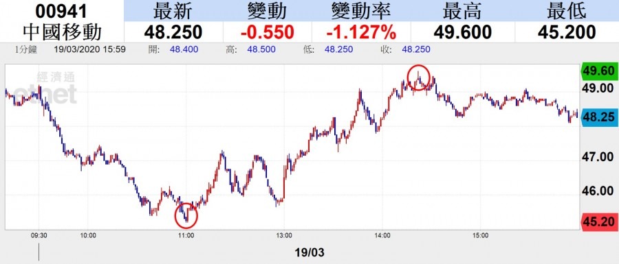 中移動(00941)中午公布業績,雖然純利跌近一成但仍勝市場預期,中移動今日股價跌幅收窄,跌1.13%,報48.25元;中國電信(00728)跌5.5%,報2.06元;中國聯通(00762)跌6.7%,報3.9元;中國鐵塔(00788)遭大行唱淡,股價跌10.71%,報1.5元;