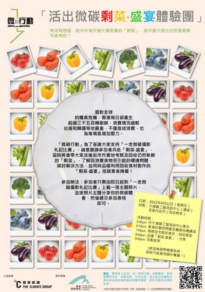 「微碳行動」為了答謝大家支持「一念微碳攝影札記比賽」,誠意邀請參加者在4月12日共赴「剩菜‧盛宴」,屆時將會帶大家走進街市作實地考察及回收仍然新鮮的「剩菜」,了解因浪費食物而引起的環境問題,探討解決方法,並同時品嚐利用回收食材製作的「剩菜‧盛宴」低碳素食晚餐!這次行程和節目相當豐富,而且費用全免!有興趣可到以下的網址登記留位。節目詳情可在登記網址內瀏覽。