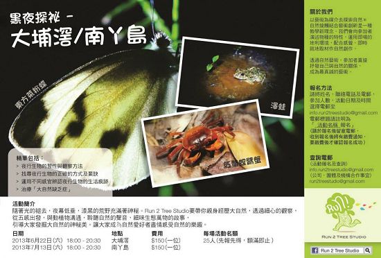 Run 2 Tree Studio會在6月22日及7月13日,舉行「黑夜探秘——大埔滘/南丫島」,透過細心觀察,利用五官觸覺,與動植物溝通,感受一下大自然的美。參加費每人$150,每場25人,先報先得。大家可在以下網址進行報名,收到報名後才有繳費通知,繳費後才會確認報名成功。大家齊去親近大自然,感受不一樣的美吧!