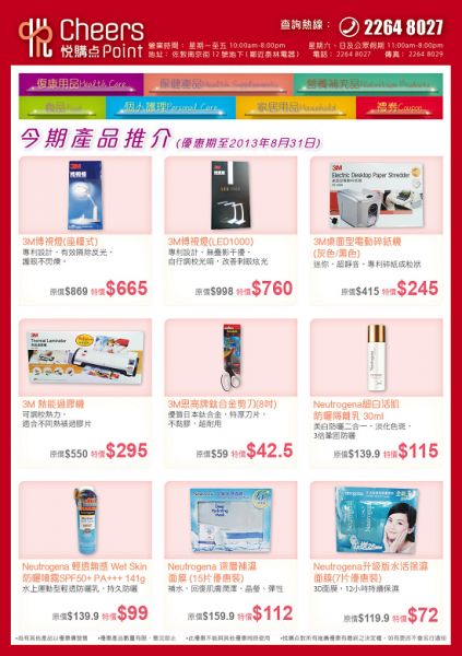 由即日起至8月31日期間,悅購点再度推出優惠,家居電器、個人護理用品及食品均有折扣優惠,例如3M博視燈(座枱式)原價$869,現特價$665;3M熱能過膠機原價$550,現特價$295;Neutrogena深層補濕面膜15片優惠裝,原價$159.9,現特價$112。此外還有其他貨品有折扣優惠,大家可參閱其宣傳海報。